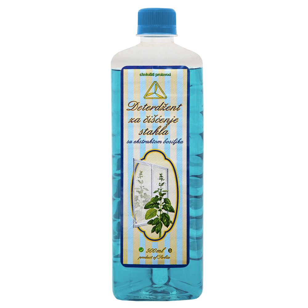 Sadrži ekstrakt bosiljka. Koristi se za čišćenje staklenih površina, ali može da čisti i plastične površine, nameštaj visokog sjaja ili farbanu stolariju. Za čišćenje prozora razredimo ga u prskalici u odnosu 1:1 do 1:3, zavisno od zaprljanosti stakla, poprskamo malo i obrišemo suvom krpom. Efekti su višestruki: čisti i dezinfikuje staklo, daje mu visoki sjaj, ostavlja na staklu bogat zaštitni film koji sprečava zadržavanje kapljica vode i umanjuje efekat prljanja, stakla se ne magle i ne zamrzavaju (do -5 stepeni celzijusa), a i rasteruje komarce (oni ne podnose miris bosiljka). Dokle god postoji zaštitni film na staklu, čistimo ga samo brisanjem suvom krpom, a kada se film istroši, ponovimo postupak sa razblaženim deterdžentom i prskalicom. Možemo ga koristiti i kao zaštitu od komaraca tako što ćemo otvorene delove kože namazati koncentratom ili ih naprskati rastvorom, a ako nas komarac i ubode, stavićemo malo koncentrata na mesto uboda i neće biti ni svraba ni otoka. Za TV ekrane, auto-stakla, naočare i slično, koristite čist koncentrat jer se tako sprečava magljenje, zaleđivanje (do -5 st.celzijusa) i statički elektricitet. Plastične i farbane površine i nameštaj neće na sebi imati statičkog elektriciteta i time skupljati prašinu. Pored svega toga ovaj koncentrat pouzdano uništava grinje. Ako ga razblažimo u osnosu 1:1 i njime isprskamo krevete, jastuke, posteljinu, tepihe, zavese, police u ormarima i sva mesta na kojima se zadržava prašina i obitavaju grinje, znatno ćemo smanjiti njihovu prisutnost ili ih potpuno uništiti. SASTAV: <5% anjonskih PAM. Sadrži dodatno: miris, ekstrakt lekovitog bilja, boju.